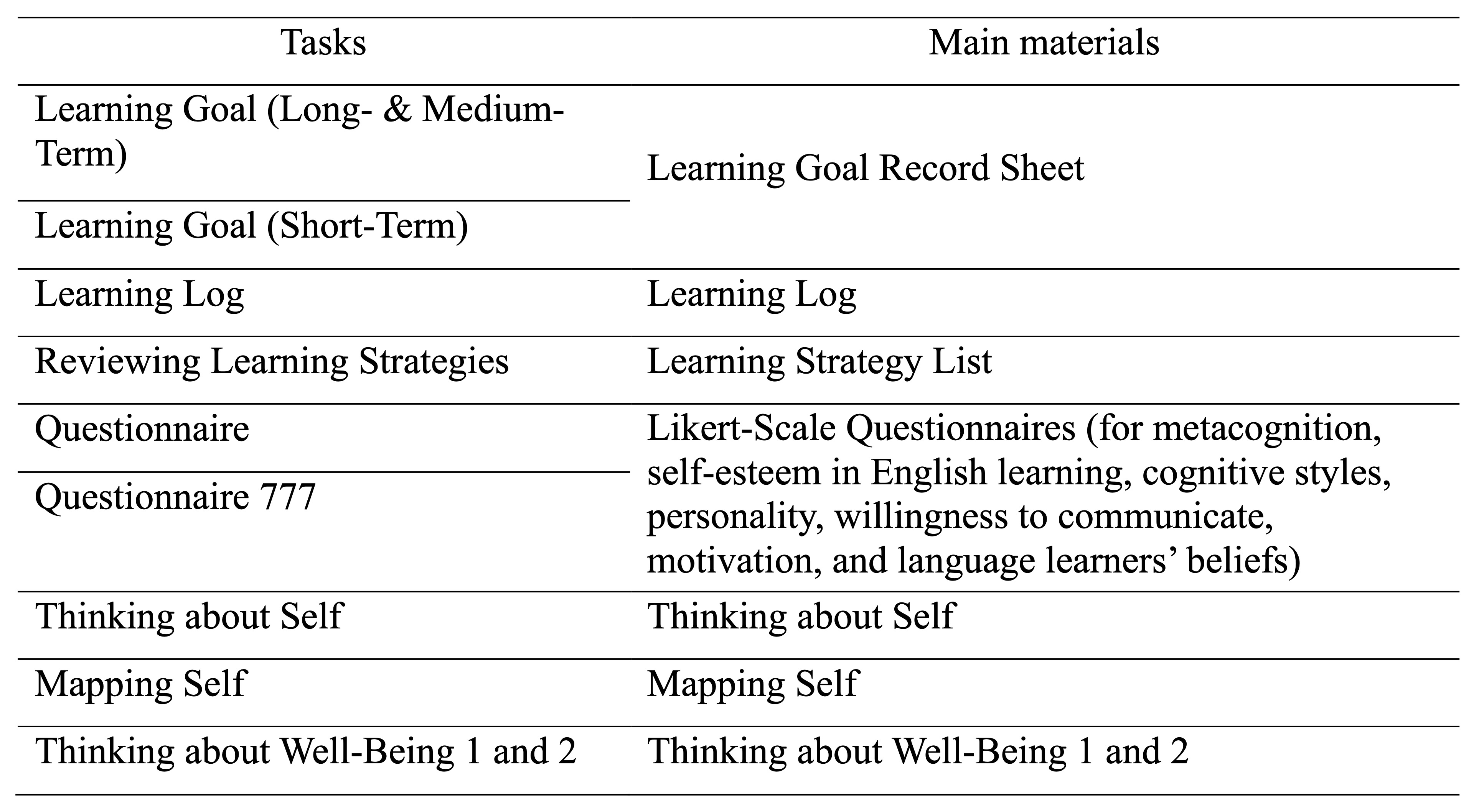 Each specific task is typically introduced using one or more dedicated materials. For example, learners keep a Learning Log that has a ready-made format, as shown in Figure 2. Additionally, in Mapping Self, they freely draw various influential factors in their language learning on a specific task sheet that has a pre-printed section in its center (Figure 3). Learners are expected to engage in these tasks conducted not only within each session, but also as take-home work. Table 1 lists the materials used for each task.