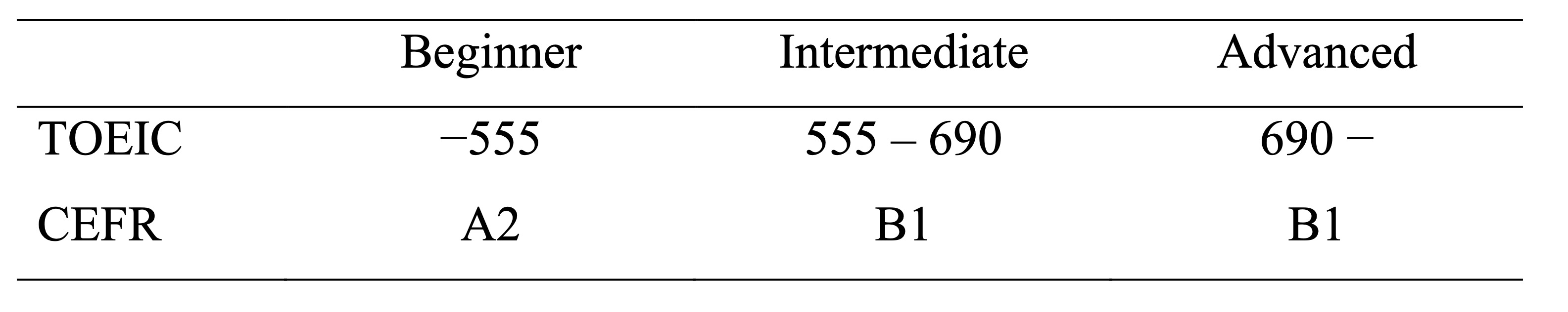 All 20 learners were typical Japanese EFL learners, who had never stayed overseas for more than three months before participating in the ALL program. Based on a placement test conducted at the target university, the 20 learners were classified into one of the following three proficiency levels: beginner, intermediate, or advanced. Table 2 shows the converted score range for the TOEIC® Listening & Reading Test and the classification based on the Common European Framework of Reference for Languages (CEFR; Council of Europe, 2001).