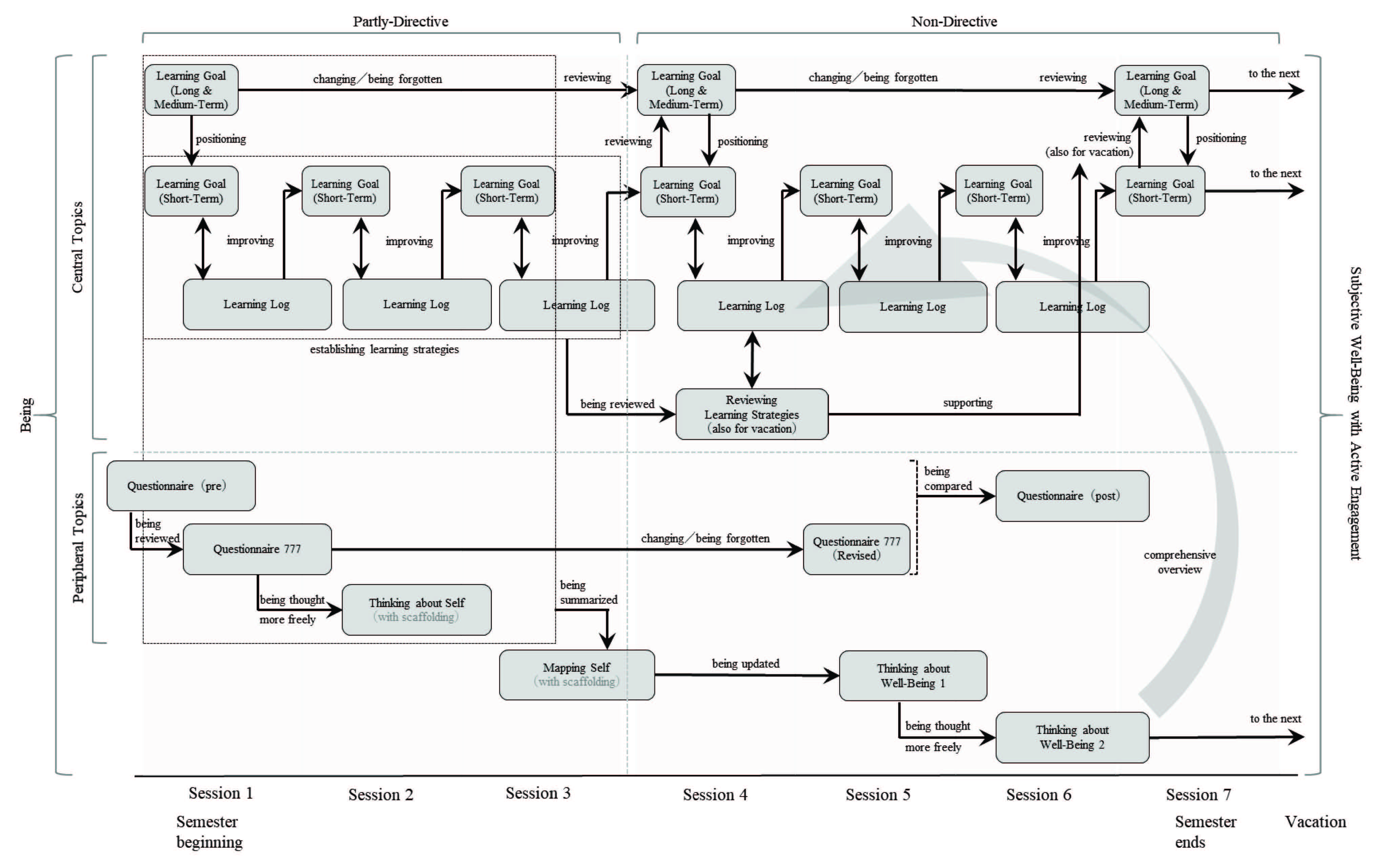 The semi-structured program was devised to lead learners from their current level of being to an ideal future goal represented by the concept of subjective well-being with active engagement (see both the left and right ends of Figure 1). This was conceptualized by Yasuda (2020), who considered important psychological and philosophical findings.