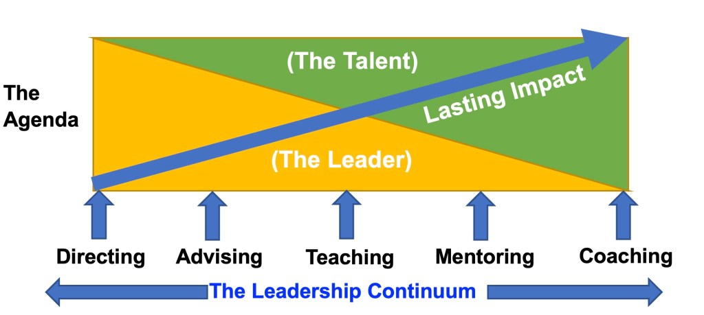 Note. The talent refers to the individual who is receiving coaching and the leader is a coach. At the Directing stage, ownership of the agenda— including the issue at hand, the decision, the challenge, the opportunity, and the Talent’s performance or aspirations, rests entirely with the leader. As the process moves through the Advising, Teaching, and Mentoring stages, the talent gradually assumes greater ownership. At the coaching stage, the agenda is fully controlled by the talent, fostering long-term, sustainable impact (Thompson, 2017, pp. 39—41).