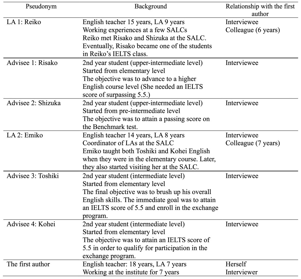 Although some discussions exist from the LAs’ perspectives, it is even more crucial to understand how advisees understand LAs’ roles than LAs do because Kato and Mynard (2015) state if advisees see LAs as tutors, they are more likely to repeatedly seek quick answers rather than engage in deeper reflection. Thus, how advisors and advisees perceive LAs’ roles is critically important for fostering autonomous learners.