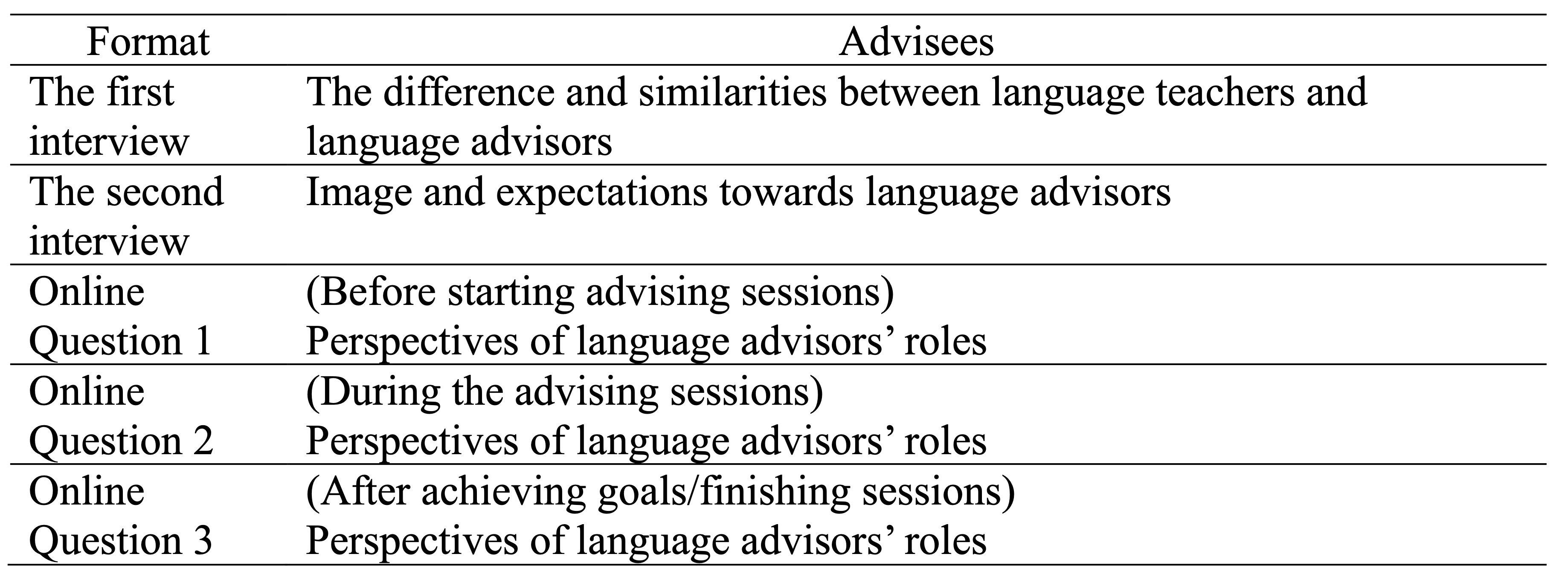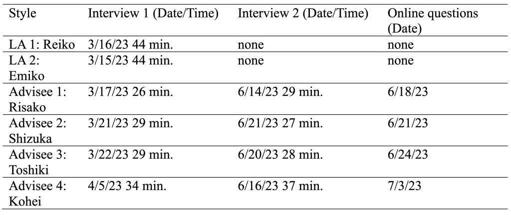 Semi-structured interviews and subsequent online questions were conducted in different styles for LAs and advisees. Table 2 provides details on the interviews, including dates, times, and the style of the data collection.
