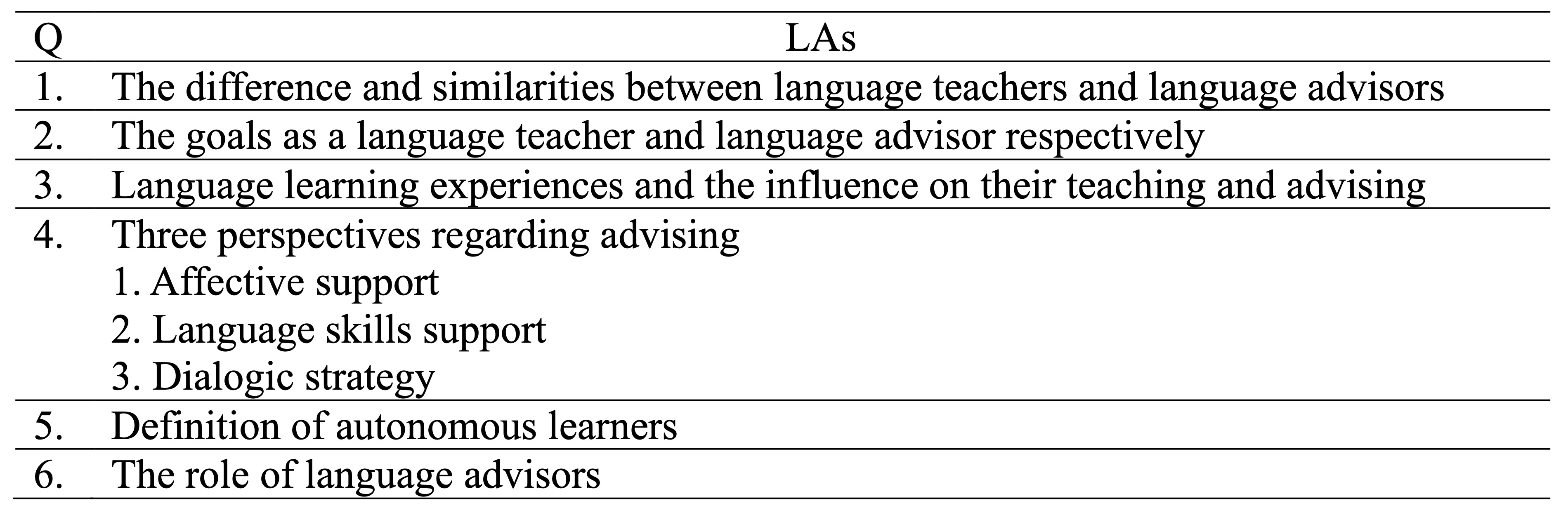 - Perspectives toward Ls (LAs’ roles, reflection on LAs, characteristics, and images of LAs)