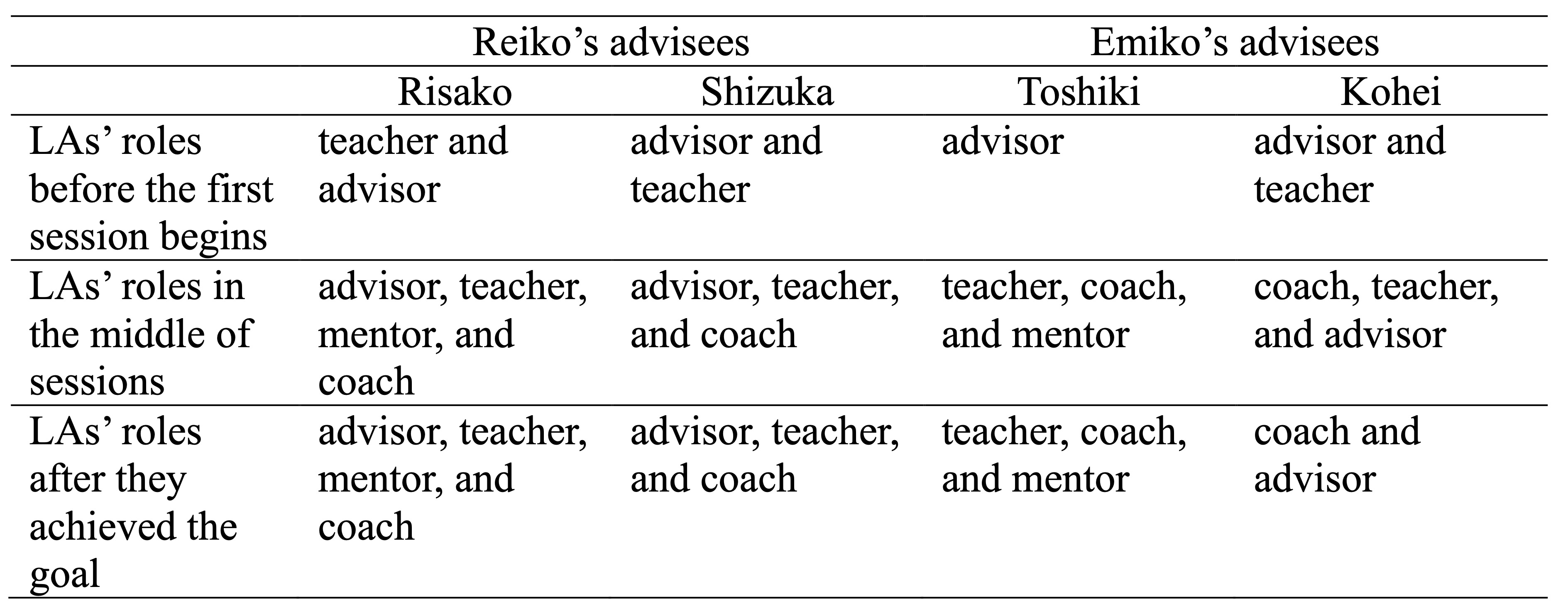 Both LAs and advisees recognize that LAs fulfill multiple roles. Initially, advisees expect cognitive support similar to teachers or advisors, but over time, they perceive mentor and coach roles as well. Toshiki and Kohei noted that LA Emiko played the role of coach, but LA Emiko found the coaching role challenging and did not adopt it. LA Reiko believed she played all roles, which Risako agreed with. However, Shizuka did not acknowledge the mentor role, focusing solely on improving her Pearson Benchmark test score without awareness of other aspects.