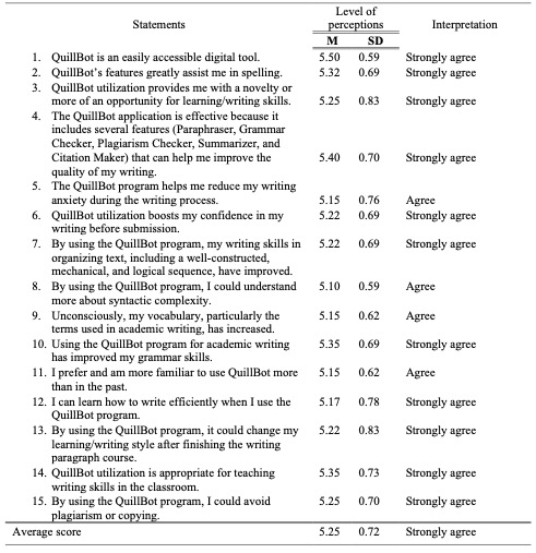 To illustrate the students’ perceptions, the researchers distributed a questionnaire to the participants and interviewed some students to explore in-depth information on QuillBot utilization. The findings are detailed in Table 2.