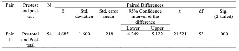 Table 1 indicates a mean score difference of 4.685. A paired t-test analysis revealed a significant improvement in students’ writing performance, with a p-value ≤ 0.05, suggesting that the training with QuillBot positively impacted their writing skills.