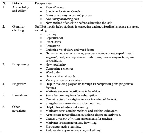 More comprehensive insights into students’ perceptions of QuillBot utilization are shown in the results of the semi-structured interviews. The students’ responses were analyzed using content analysis and categorized into six facets, as outlined below.