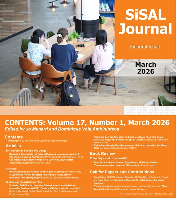 Hobbs, M., & Dofs, K. (2017). Self-access centre and autonomous learning management: Where are we now and where are we going? Studies in Self-Access Learning Journal, 8(2), 88–101. https://doi.org/10.37237/080203