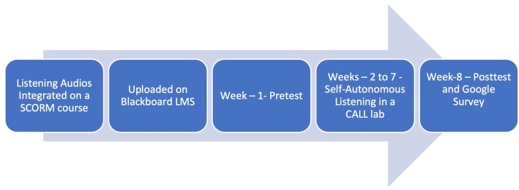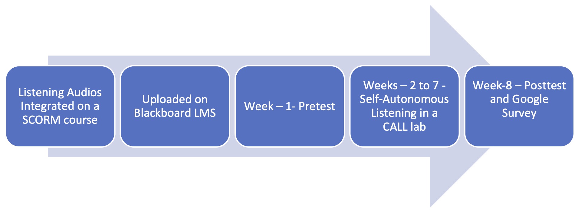 In Week 1, participants completed a vocabulary pretest in the CALL laboratory under the researchers’ supervision. From week 2 to week 7, students completed two SCORM listening courses every week for an hour in the language lab. The instructor did not pedagogically guide the students, but was available to help with any technical issues. The SCROM modules and audio materials could be attempted multiple times, and the Blackboard LMS showed learners’ progress, which supervisors monitored. Although 30 students initially volunteered to complete the pretest, only 19 completed all 12 listening modules, and 17 finished the posttest. In week 8, the vocabulary posttest was conducted in the CALL lab. Subsequently, the survey link on Google Forms was shared on Blackboard LMS, which they completed in their free time.