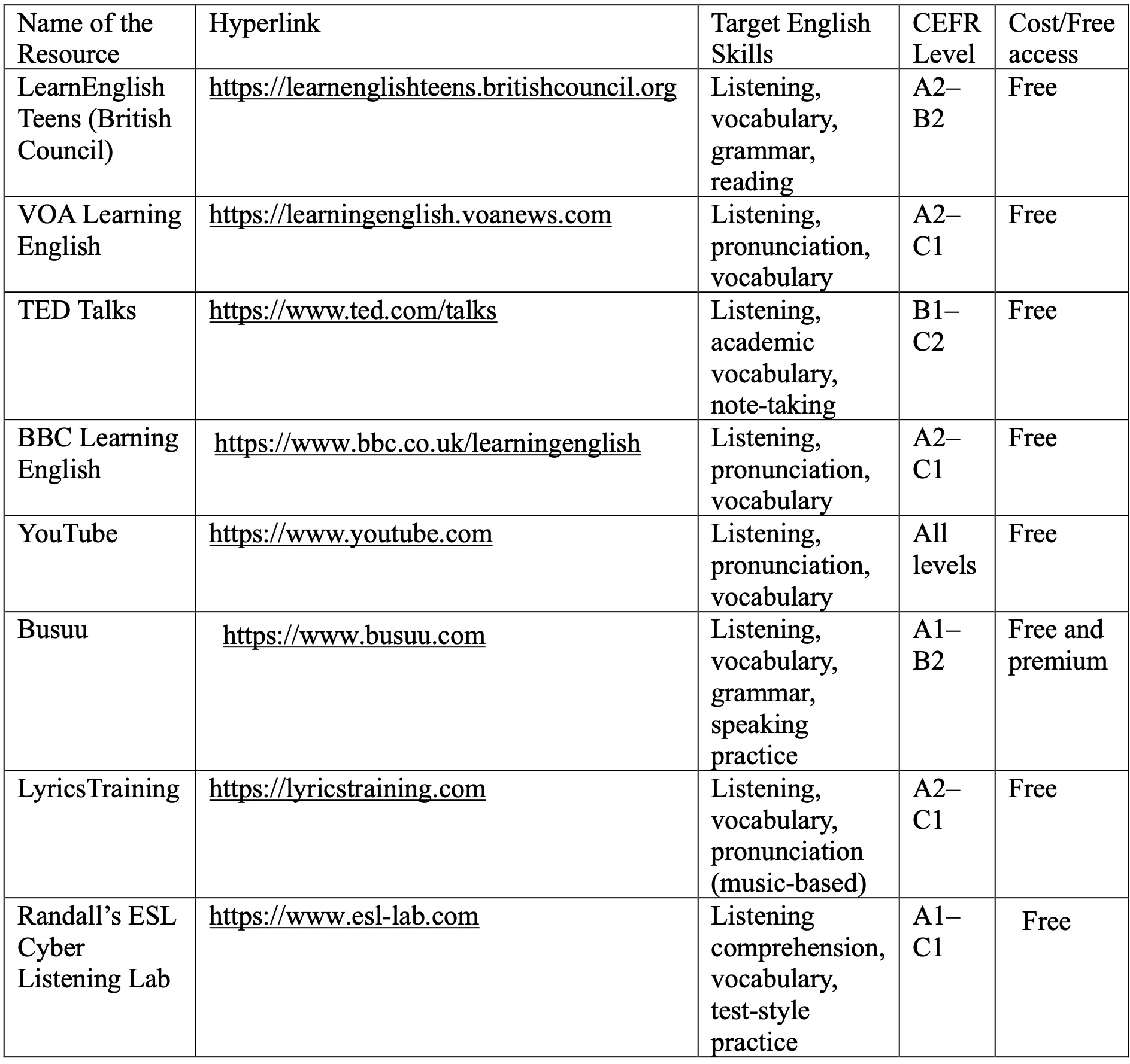 Table 1 below shows that many digital resources have been used in previous studies to enhance vocabulary learning and listening skills. Most online platforms have free listening materials available; it is useful to integrate them for autonomous activities (Yang, 2020).