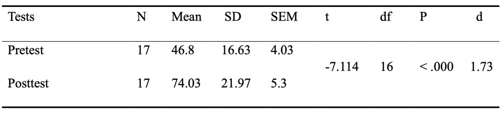 The paired‑samples t-test was conducted comparing learners’ vocabulary scores before and after autonomous listening, and the results showed improvement in vocabulary performance. The pretest scores (M = 46.80, SD = 16.63) were substantially lower than posttest scores (M = 74.03, SD = 21.97), displaying noteworthy vocabulary gains following the intervention, and the difference between the two assessments was statistically significant, t (16) = –7.114, p < .001, with a mean difference of 27.24 points. While the pretest and posttest gains in vocabulary were statistically significant and had a large effect size, the results must be understood with caution, since one‑group pretest–posttest design does not allow causal claims, and the results might be influenced by uncontrollable factors (Campbell & Stanley, 1963). Therefore, the results demonstrate the potential effectiveness of autonomous listening rather than definite evidence.
