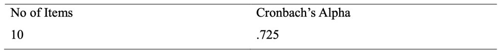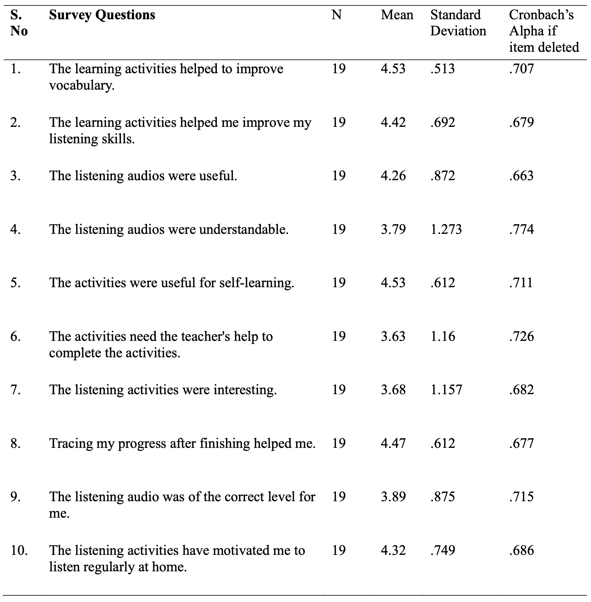 Table 3 displays the ten-item Likert‑scale questionnaire that was used to find out students’ perceptions of autonomous listening through SCORM modules. Since the responses were numerical, the survey analysis is quantitative. Table 4 indicates that the internal consistency of the overall scale was acceptable (Cronbach’s α = .725), which exceeds the recommended threshold of .70 for exploratory research, as they fit together coherently.