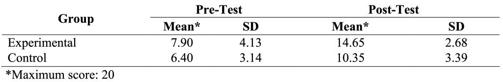 To answer the first question of the research, which seeks to identify potential statistically significant differences (at α=0.05) in Jordanian EFL sixth-grade students’ overall writing performance which may be attributed to the instructional modality, the means and standard deviations of the participants’ pre- and post-test scores were calculated, as shown in Table 2.