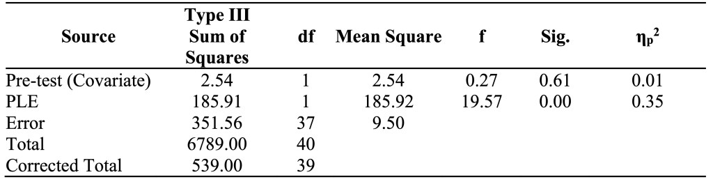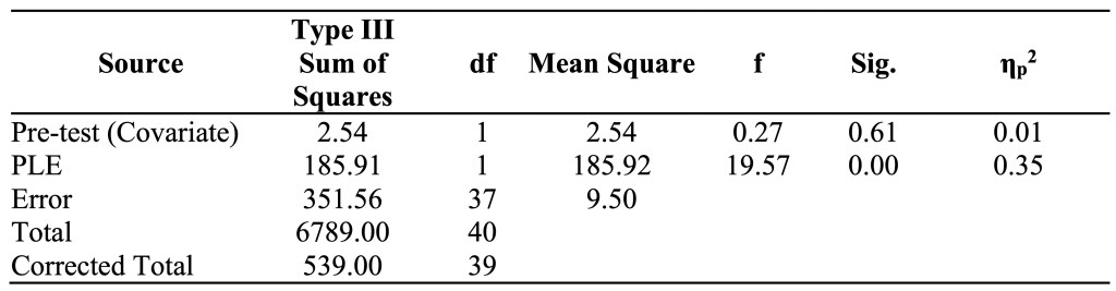 One-Way ANCOVA of the Effect of PLE on Overall Writing Performance (After Controlling for the Effect of the Pre-Test)
