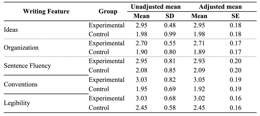 Table 5 shows that, even though the pre-test mean scores of the experimental and control group participants in the five writing features (viz., ideas, organization, sentence fluency, conventions, and legibility) are similar, observed differences are found in the two groups’ participants’ post-test mean scores.