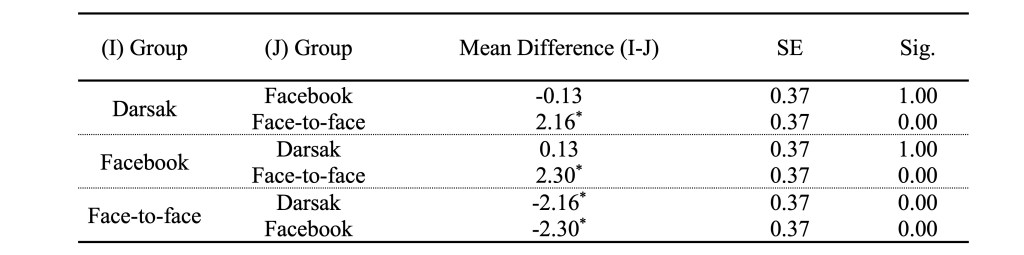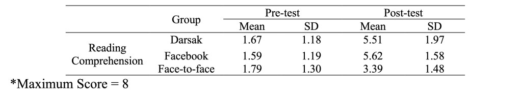 Table 4 shows that the overall reading comprehension mean scores of the Darsak and Facebook groups are significantly higher than that of the face-to-face group. However, no statistically significant differences in overall reading comprehension are found between the two experimental groups.