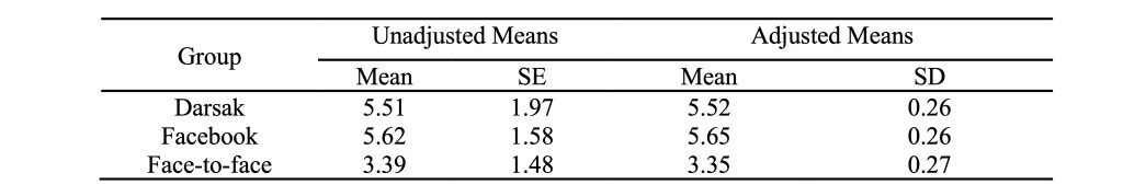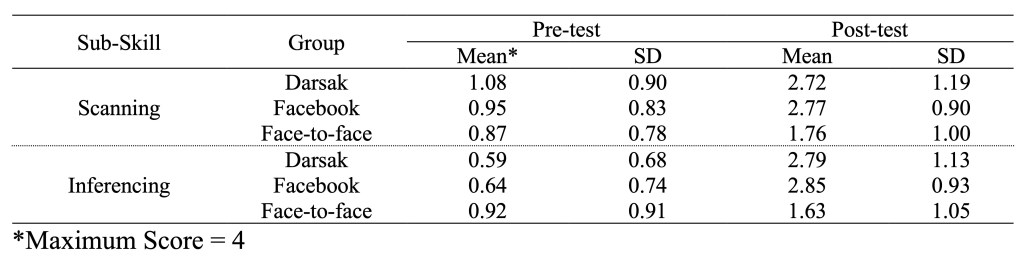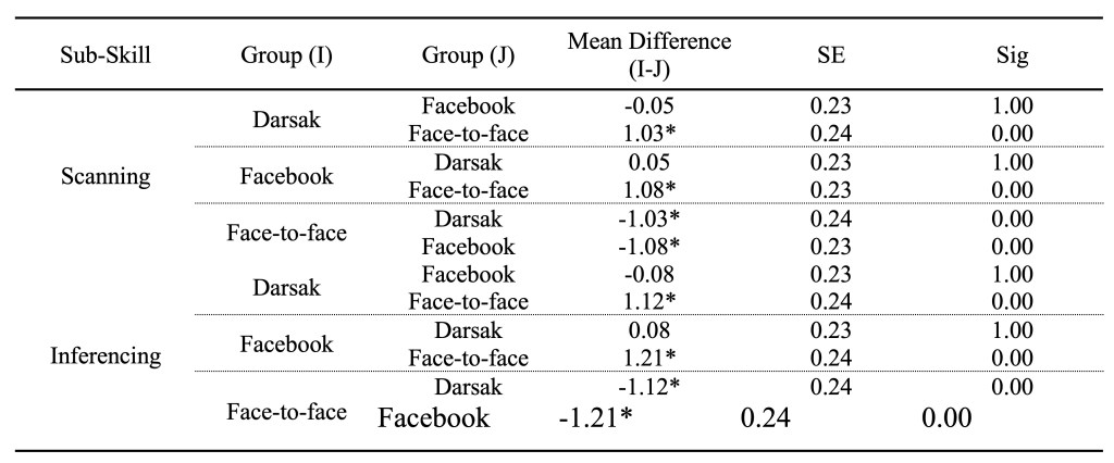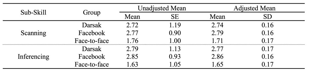 Table 5 shows observed differences in the mean scores of the three groups’ post-test performance in the sub-skills of scanning and inferencing, as the two experimental groups seem to outperform the control group in the sub-skills of reading comprehension. However, the Facebook group seems to outperform the Darsak experimental group in both sub-skills.