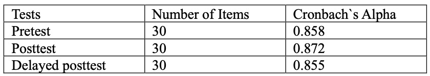 The investigators created three sets of assessments to track students’ performance before and after the treatment: pretests, posttests, and delayed posttests. Each exam consisted of thirty questions, a mix of multiple-choice and fill-in-the-blank questions. SPSS software version 27.0 was used to measure the three tests. Before the examinations were administered, thirty Omani EFL learners from the same institution piloted the test, and three holders of doctoral degrees in Applied Linguistics approved it. The test reliability is shown in Table 1.