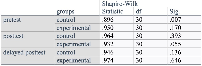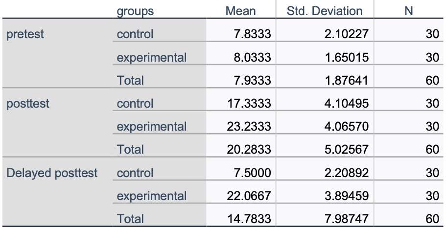 Table 3 shows that the control group’s pretest does not follow a normal distribution (p = 0.007), whereas the experimental group’s pretest does (p = 0.170). The posttest scores of the control group (p = 0.393) and the experimental group (p = 0.055) met the normality criterion. The control group (p = 0.136) and the experimental group (p = 0.646) showed similar normality in the delayed posttest scores. Therefore, both parametric and nonparametric tests will be conducted to compare the participants’ results within their groups and between groups. Table 4 below presents the descriptive statistics of the tests across both groups.