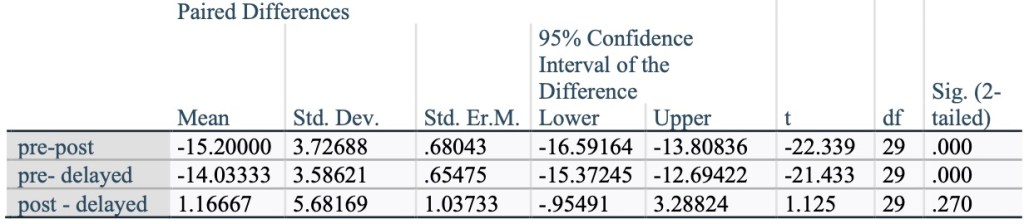 Table 5 reveals significant differences (p < 0.0001), indicating substantial improvements in scores from the pretest to the posttest. The comparison of pretest and delayed posttest scores did not reveal any significant differences, with a p-value of 0.666, indicating that the scores could not be maintained over the long term. In addition, the comparison of the posttest and the delayed posttest shows a significant difference in scores between the two sets of tests (p <), indicating a substantial decline in scores in the delayed posttest. The results confirmed the students’ initial progress in the posttest; however, retention of vocabulary knowledge was unsatisfactory. To compare the participants’ results in the experimental group, a parametric test, the Paired-Samples T-Test, was conducted; the results are presented in Table 6 below.