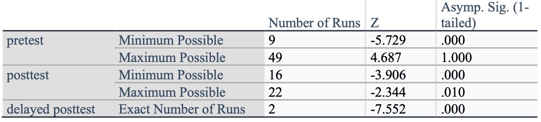 Table 7 shows no significant difference between the two groups in the pretest (p = 0.604). However, comparing the posttests reveals substantial differences between the results of the two groups (p = 0.000). In addition, comparing the delayed posttest reveals the same results as the (p = 0.000). To determine which group performed better in the tests, a Wald-Wolfowitz test was conducted; the results are presented in Table 8 below.