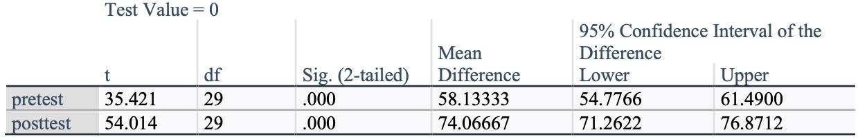 The second part of this section analyzed the self-regulated learning of the experimental group before and after the treatment. A One-Sample T-test was run to compare students’ performance in the pretest and posttest, and Table 9 below shows the results.