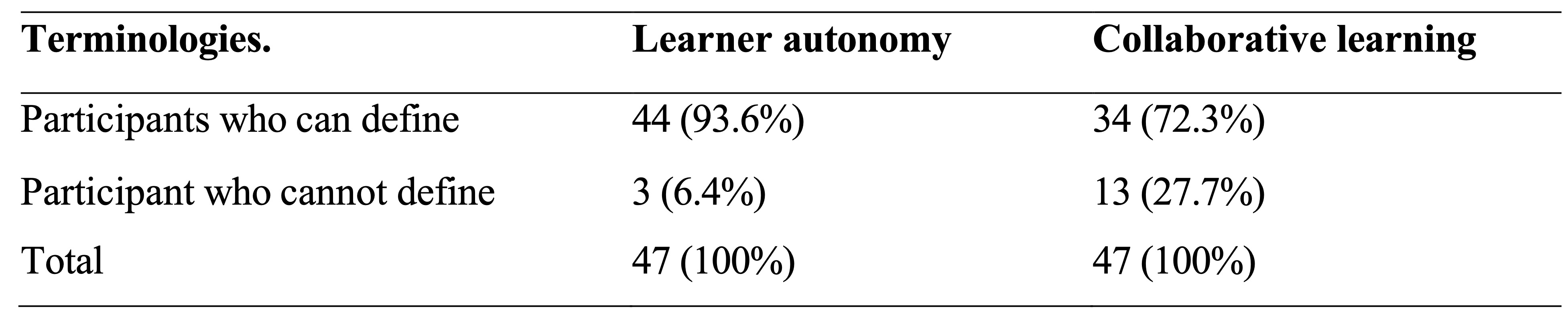 However, the level of comprehension of the concepts of LA and collaborative learning differed among the ELT teachers who took part in the study. As Table 2 shows, 93.6% of the participants were able to give a clear explanation of the concept of LA, while 6.4% of the survey sample did not fully comprehend what LA is, which is similar to what Elliot (2016) found in his/her investigation. Therefore, this prompts an additional inquiry regarding the ability of TA. If lecturers are unable to define genuine autonomy themselves, should they assert that it is being cultivated in their own teaching practice, as stated in statement 26 of “Am I an autonomous teacher?” All three English lecturers (Participants 28, 29, and 30) identified themselves as independent educators. It is probable that some lecturers who endorsed the perspective of “individual” autonomy still find the concepts of autonomy to be problematic knowledge (Geng, 2010). This could be due to the complex and multifaceted nature of learner autonomy, which requires a shift in traditional teaching practices and roles. LA was described by participants in various ways in the online survey. Participant #29 defined LA as “the learner’s attention and participation outside their classes,” while Participant #30 viewed LA as “the motivation of self-study at home.”