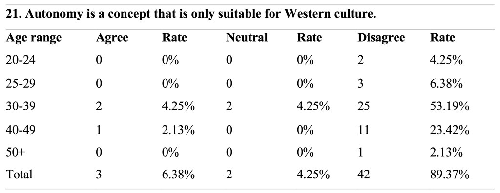 As Table 3 shows, a total of 3 out of 47 participants indicated their agreement with question 21. Richards and Lockhart (1994) state that teachers’ beliefs are focused on the specific language learning and teaching experience in a particular context. The beliefs of these participants appeared to be associated with the collectivist culture in the Asian context, where teachers are perceived as knowledge providers or authoritative figures.