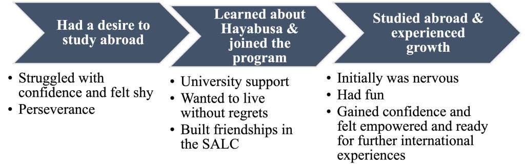 Saki stated that she enrolled in Hayabusa College because she was informed that she would receive support from the professors and a financial scholarship to study abroad. She also indicated that she did not want to have any regrets at the end of her university life. The chance to study abroad was a transformative experience for her, as she began with a lack of confidence and, in the end ,felt like “I could do anything.” In addition, she had a positive experience during the study abroad program, as indicated below in the following passage from her narrative.