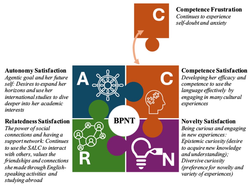 Secondly, competence frustration is when the individual perceives that one is incapable of achieving the desired outcome of some task (Ryan & Deci, 2017). In the context of this study, this likely includes using English for communication in an unstructured environment like a SALC. This frustration may stem from various factors such as a lack of skill, unrealistic expectations (e.g., must be fluent to use the language), or having received constant negative feedback in the past (e.g., low test scores). Repeated experiences of competence frustration likely result in lower motivation to engage in a specific task. In a previous study (Birdsell, 2018) with Japanese participants using a 6-point Likert scale, the results show that competence frustration (4.48) is considerably higher than frustration for other basic psychological needs such as autonomy (3.61), relatedness (3.31), and novelty (3.65). Additionally, this is the only need where frustration scored higher than satisfaction. As for Saki, this also was one of the major challenges she faced. She struggled with the belief that she did not have the competence to use English in a setting like a SALC and this led to negative affective states such as heightened anxiety and self-doubt. However, she did attempt to overcome this by engaging in many different international and cultural activities both in and outside the SALC and this gradually improved her sense of competency.