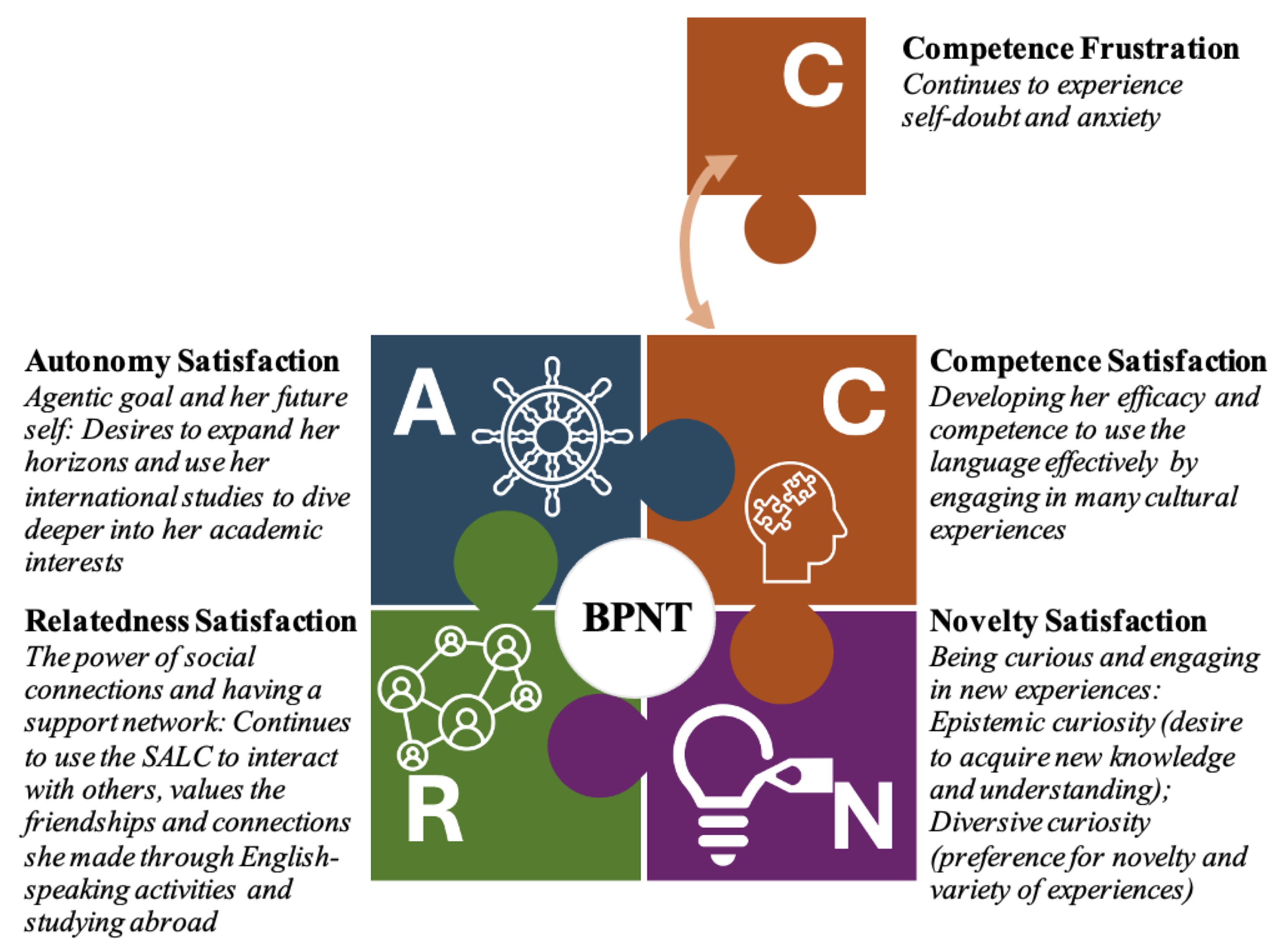 Secondly, competence frustration is when the individual perceives that one is incapable of achieving the desired outcome of some task (Ryan & Deci, 2017). In the context of this study, this likely includes using English for communication in an unstructured environment like a SALC. This frustration may stem from various factors such as a lack of skill, unrealistic expectations (e.g., must be fluent to use the language), or having received constant negative feedback in the past (e.g., low test scores). Repeated experiences of competence frustration likely result in lower motivation to engage in a specific task. In a previous study (Birdsell, 2018) with Japanese participants using a 6-point Likert scale, the results show that competence frustration (4.48) is considerably higher than frustration for other basic psychological needs such as autonomy (3.61), relatedness (3.31), and novelty (3.65). Additionally, this is the only need where frustration scored higher than satisfaction. As for Saki, this also was one of the major challenges she faced. She struggled with the belief that she did not have the competence to use English in a setting like a SALC and this led to negative affective states such as heightened anxiety and self-doubt. However, she did attempt to overcome this by engaging in many different international and cultural activities both in and outside the SALC and this gradually improved her sense of competency.