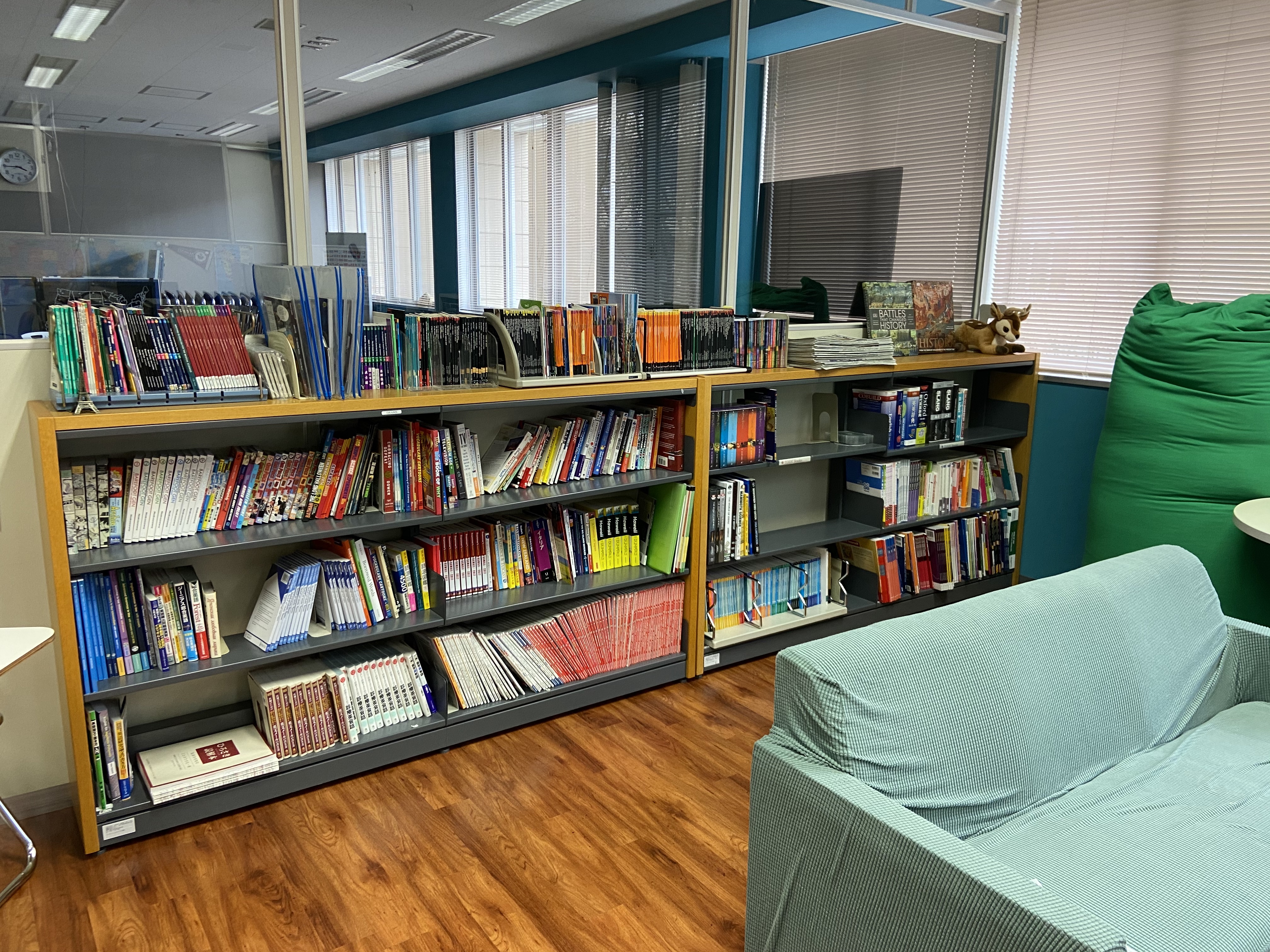 Figures 1 to 3 are photos from the three main areas of the English Lounge. Teachers hold special workshops and seminars in the Seminar Room. The English Lounge Forum also uses this space (see Katagiri, in this issue, for more information). The Reading Corner has graded readers and other English learning materials for students. The Conversation Space is an open space with sofas and chairs for students to interact with each other, play games, converse, and learn about different cultures. English Lounge Supporters – exchange students at the university – are hired to run this section of the SALC.