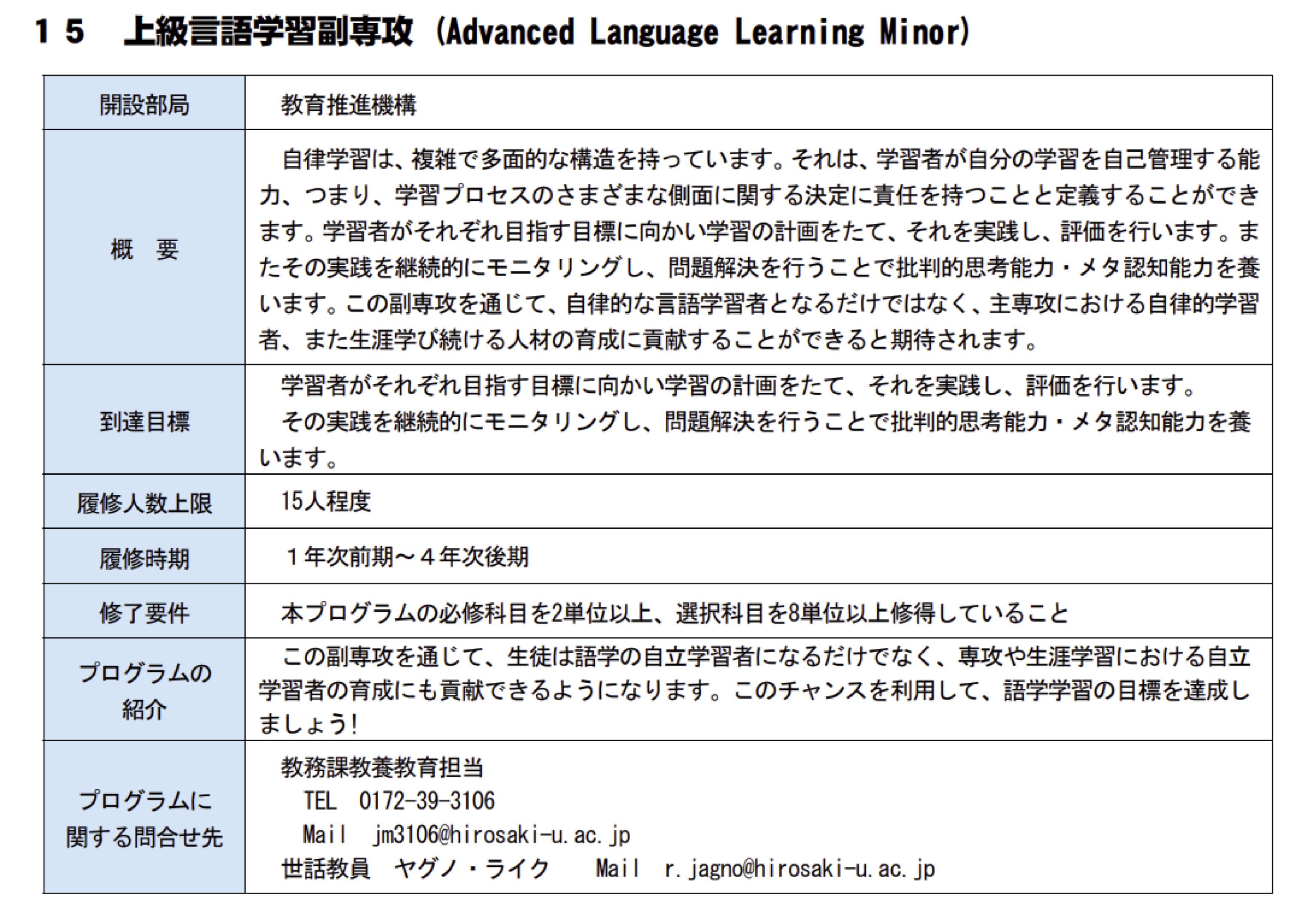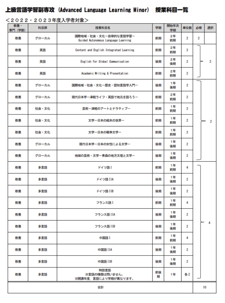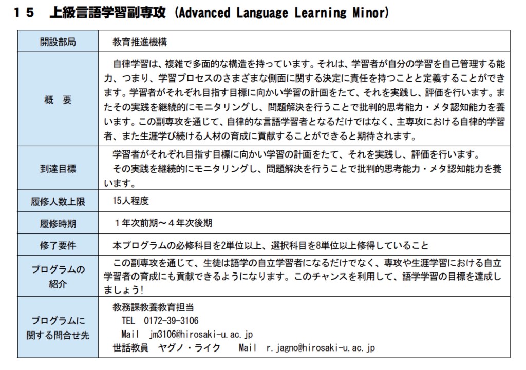 The four minors cover a range of topics. The Gender and Equality minor is akin to gender studies courses provided at various universities. The International Liberal Arts minor encourages students to study in English or other languages, strengthening Hirosaki University’s identity as a “glocal” institution and connecting local and global topics. Another minor focuses on language skills, while the final one, the “Advanced Language Learning” minor, not only covers language skills but also emphasises the importance of autonomous learning, self-improvement, and effective study techniques (see Figure 1 for the university description of the minor in Japanese, which describes the content and goals of it). Figure 2 shows the required and elective courses for completing the Advanced Language Learning minor programme. For example, as part of this minor, all students are required to take the “Guided Autonomous Language Learning” course and then select from a variety of Advanced English, Liberal Arts, and other non-English foreign language courses besides English.