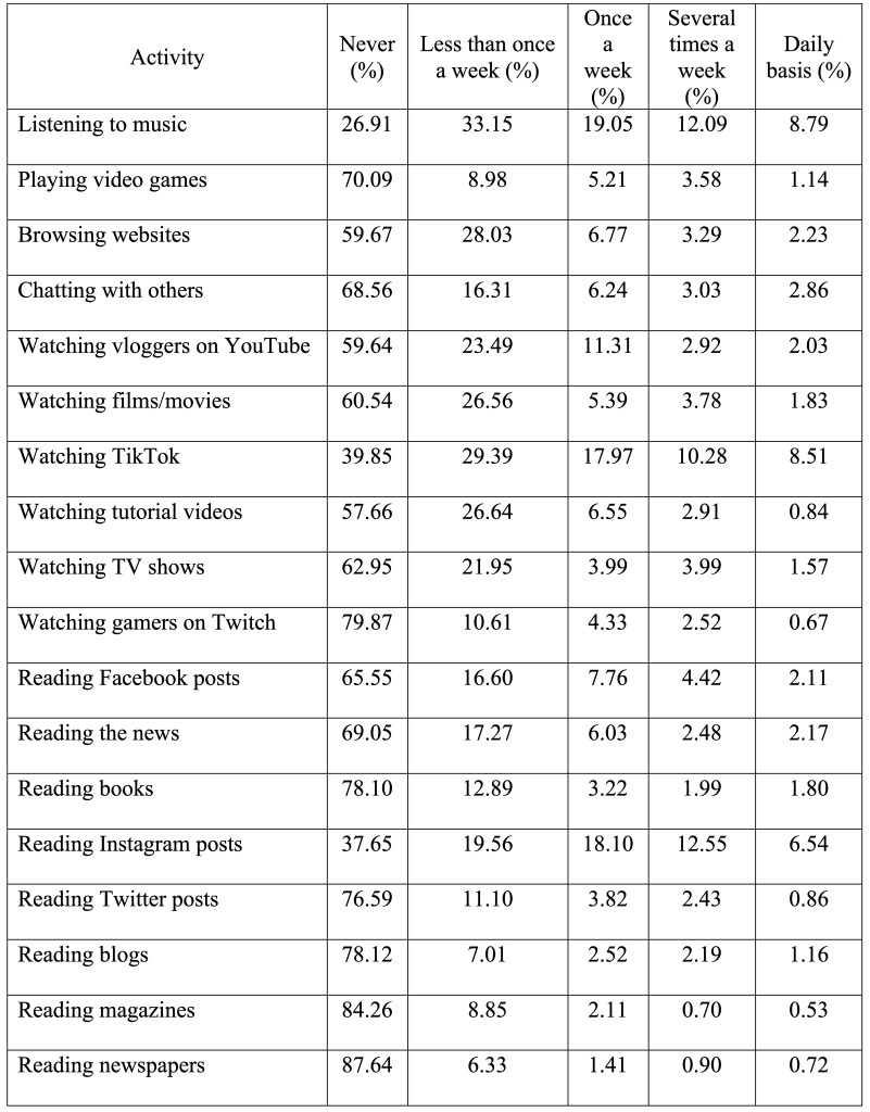 In addition, based on the findings of previous research (Fajt, 2021), frequency of engagement in 18 extramural German activities (for a list of the activities, see Table 1) was also investigated using the following Likert scale: (1) never, (2) less, than once a week, (3) once a week, (4) several times a week, (5) every day.