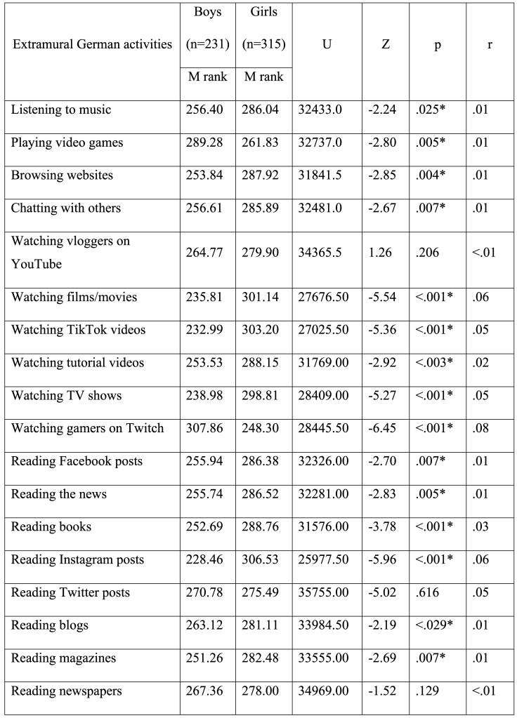 As a second step, statistically significant differences between genders in the frequency of engaging in extramural German activities were investigated by running non-parametric tests, more precisely Mann-Whitney U tests. Non-parametric tests, such as the Mann-Whitney U test, are more appropriate for analysing ordinal data (e.g. the data in this study measuring frequency of engagement in extramural activities) as such statistical procedures do not require the data to meet the stringent assumptions of parametric tests (e.g. the normality of the data).,The results of Mann-Whitney U tests are reported in Table 3.