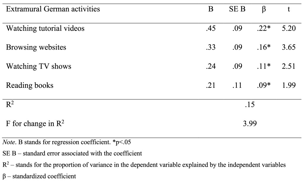 Of all extramural German activities, four extramural German activities have an impact on motivated language learning behaviour, but the explanatory power of the regression model is only 15% (R2=.15), i.e., only 15% of motivated language learning behaviour is predicted by engagement in different extramural German activities. Among the activities, three activities have a β value higher than .10 (watching tutorial videos, browsing webpages and watching TV shows), which is still considered relatively low. The last activity has an even lower β value (β<.10), therefore, it predicts an even smaller proportion of motivated GFL learning behaviour.