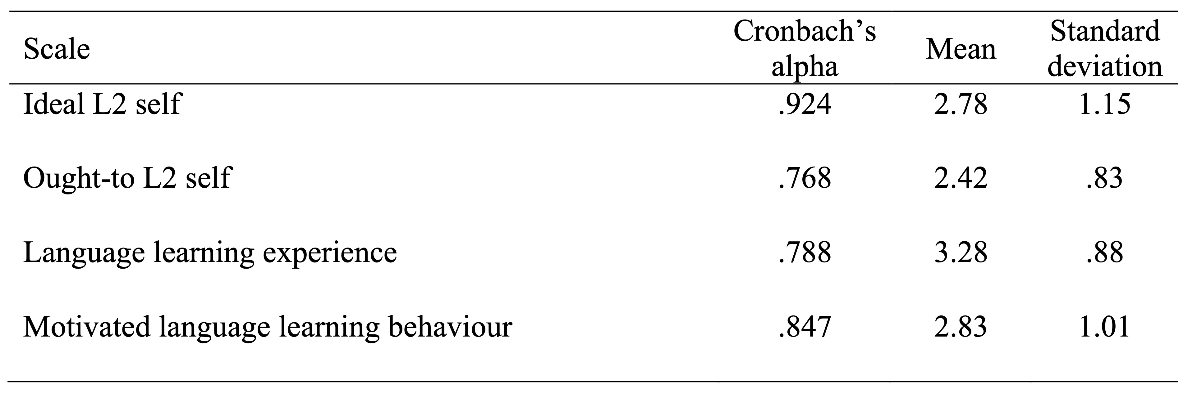 As for the four multi-item scales (Ideal L2 self, Ought-to L2 self, Language learning experience, Motivated language learning behaviour), the Cronbach’s alpha coefficients (α) were calculated to investigate the internal consistency of scales. This was important to ensure that the four scales are reliable.