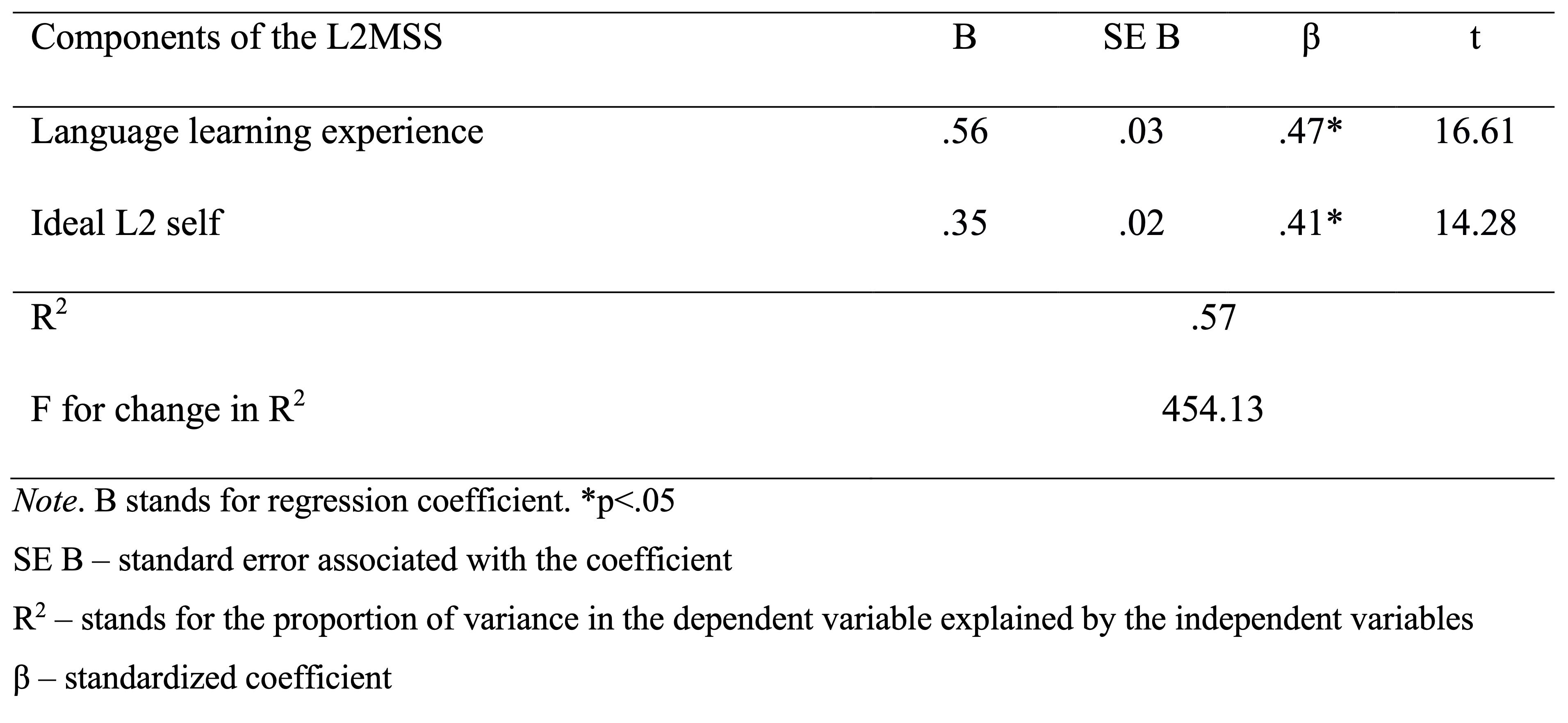 Finally, it was also investigated which of the components of Dörnyei’s (2005) L2MSS (independent variables) determine participants’ motivated GFL learning behaviour (dependent variable) using linear regression analysis (see Table 5).
