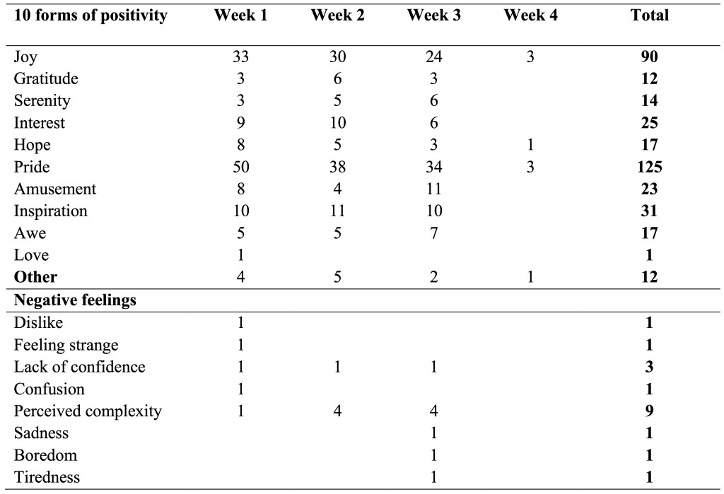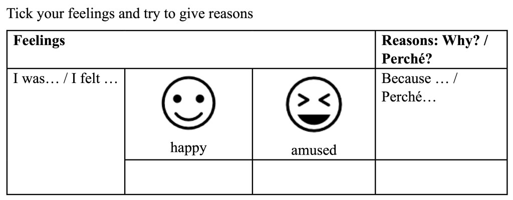 Similarly, students were here provided with a list of cues that combined: i) the Positivity Self Test (Fredrickson, 2009), ii) the vocabulary found in the learners’ coursebook units about the topic of feelings and emotions, and iii) a selection of adjectives associated with the above mentioned ten forms of positivity. Each adjective was translated into Italian using reliable online dictionaries[3], which were also consulted to find additional and more suitable synonyms to the adjectives proposed by Fredrickson. With the purpose of ensuring variety and boosting learners’ lexis of feelings, some attributes that may appear to have overlapping meanings, were selected, e.g., ‘happy’, ‘joyful’, ‘glad’, and ‘thankful’ and ‘grateful’ for the forms of positivity of ‘joy’ and ‘gratitude’ respectively. Despite the helpfulness of this list, participants were left free to employ other phrases to express their feelings. In order to help learners construct their sentences, starters such as “I felt … / I was …” were added. Indeed, the guidance and opportunity to make choices are core elements of a teaching intervention aiming at fostering both autonomy and positivity at the same time.