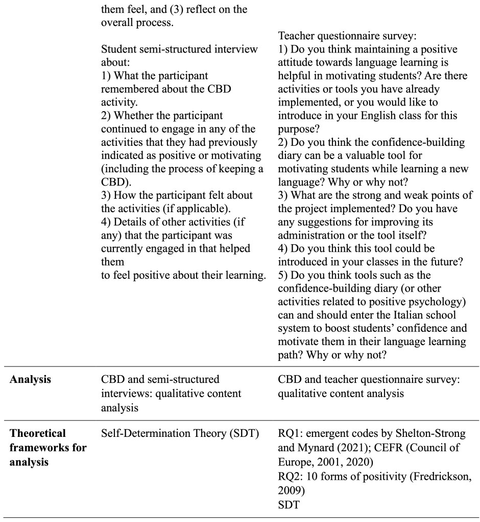 Shelton-Strong and Mynard (2018, 2021) employed the confidence-building diary (CBD) within a PPI-oriented programme with the aim of boosting university students’ confidence and positive attitude towards language learning and use. While maintaining a similar design and procedures, the replication study underwent some necessary modifications justified by the intention to address a different target and context. Commonalities and differences are outlined in Table 1.