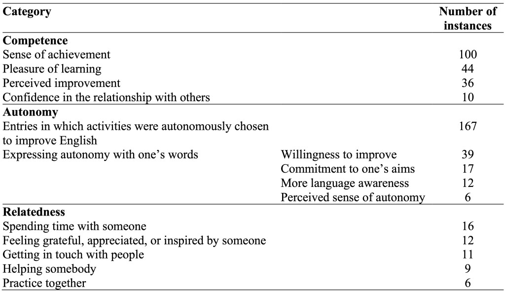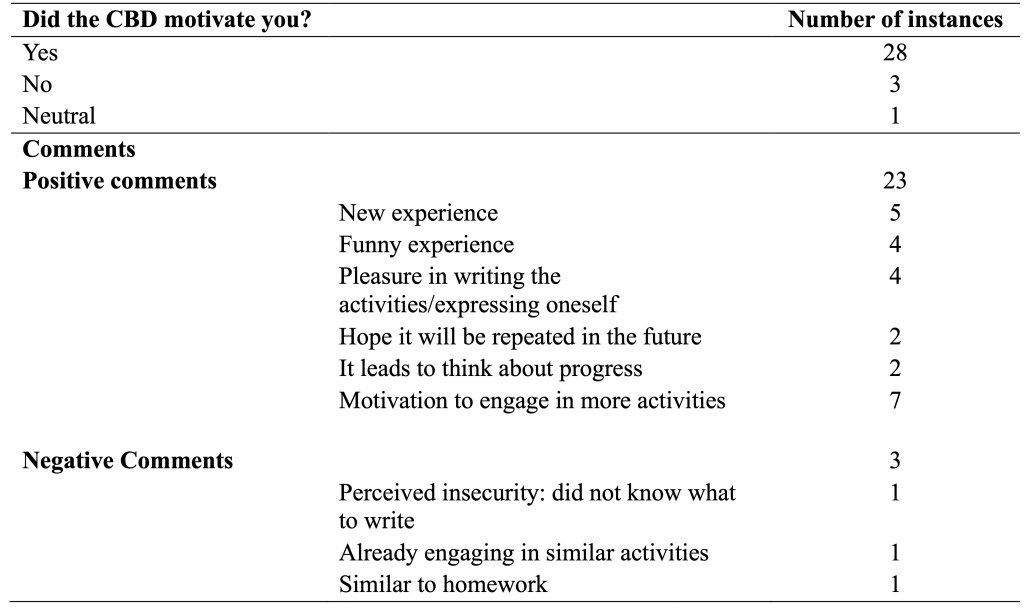 In the following paragraphs, findings relevant to proving or otherwise the successful application of the CBD to another educational context will be discussed. In the original study, the tool was demonstrated to be “effective […] for promoting positive feelings and supporting students’ basic psychological needs” (Shelton-Strong & Mynard, 2021, p. 1). In the replication study, three factors were considered to validate the efficacy of the CBD, namely: i) students’ active and autonomous engagement in language learning activities; ii) the prevalent emergence of positive feelings; iii) students’ motivation, investigated also through the identification of basic personal needs.