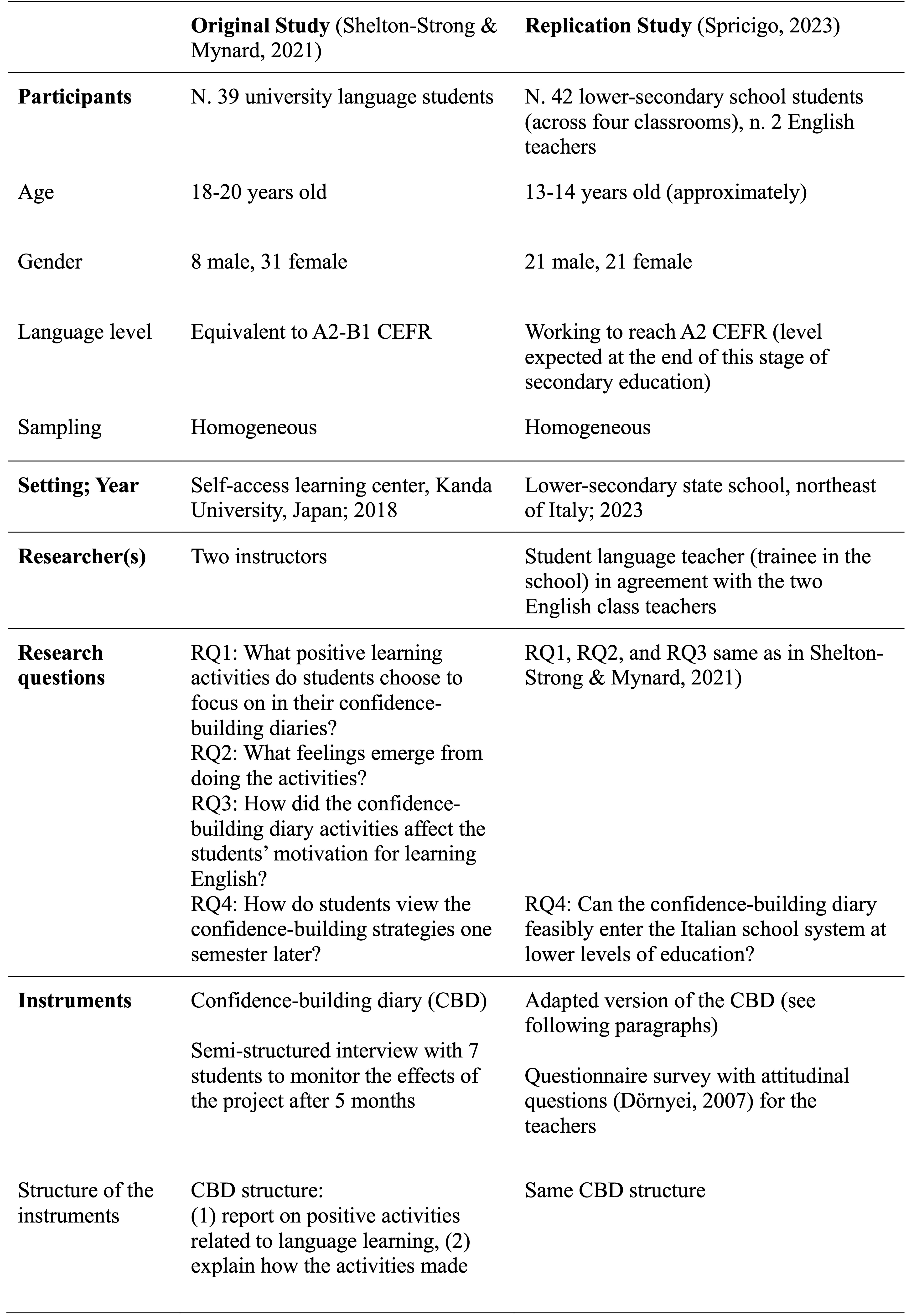 Shelton-Strong and Mynard (2018, 2021) employed the confidence-building diary (CBD) within a PPI-oriented programme with the aim of boosting university students’ confidence and positive attitude towards language learning and use. While maintaining a similar design and procedures, the replication study underwent some necessary modifications justified by the intention to address a different target and context. Commonalities and differences are outlined in Table 1.