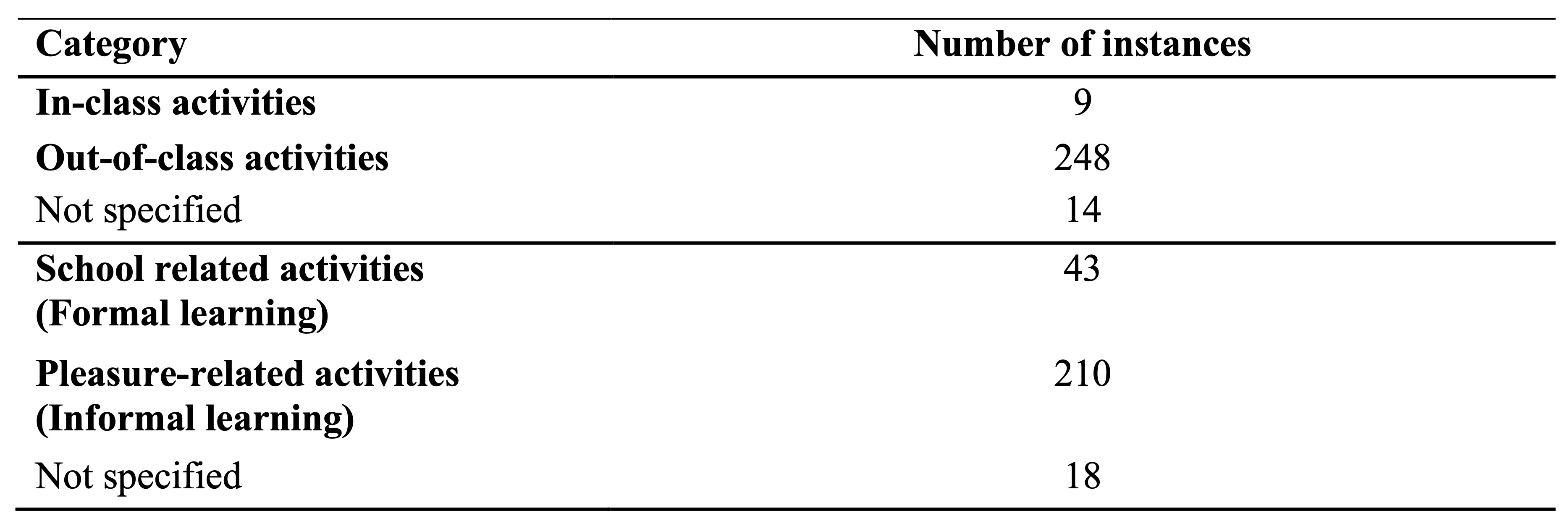 In Spricigo (2023), learning activities were first categorised into ‘in-class’ and ‘out-of-class’ activities, as in Shelton-Strong and Mynard (2021). In both studies it was found that the majority of learning activities that the students chose to focus on took place outside of the classroom environment. Furthermore, with the aim of investigating the nature of activities and student engagement further, Spricigo (2023) divided data into ‘school-related’ and ‘pleasure-related’ activities, which align with formal/curricular and informal/extracurricular learning, respectively (see Table 2 for details). Pleasure-related activities such as watching films or videos and listening to music were reported as the most frequent among young students.