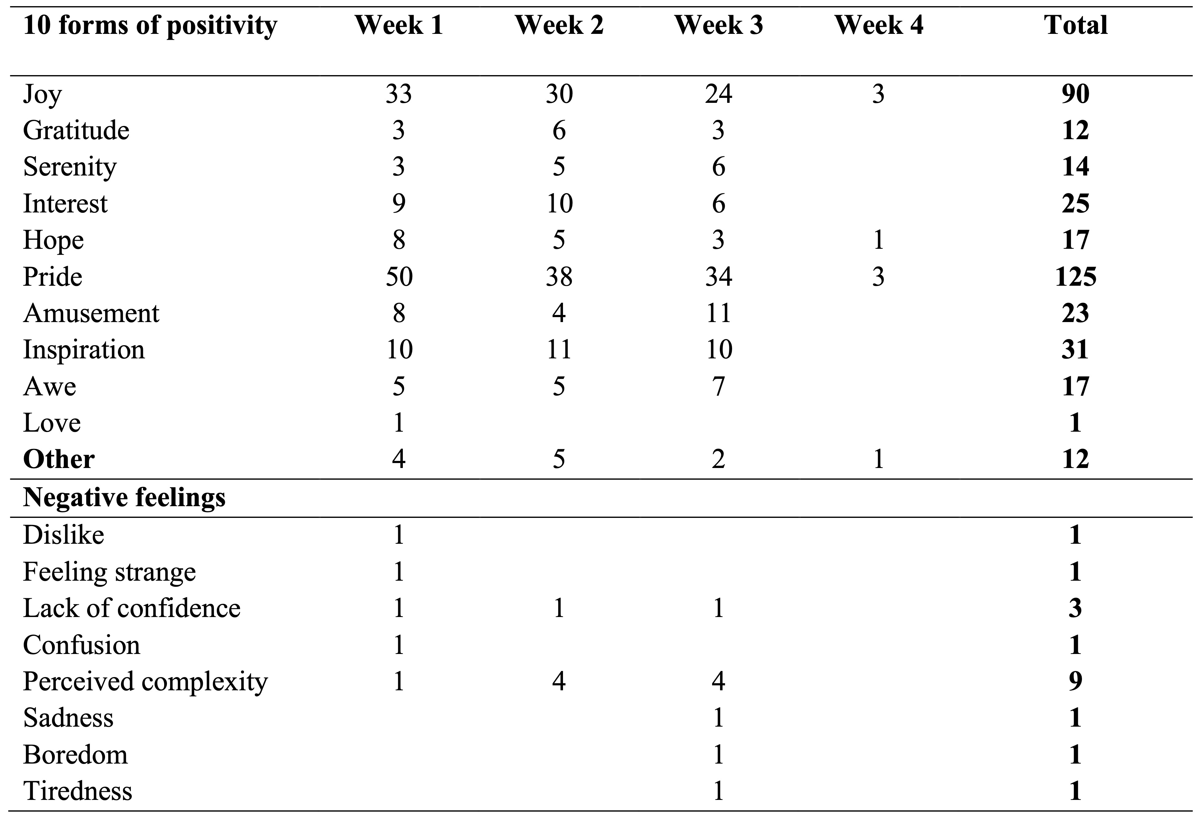 Similarly, students were here provided with a list of cues that combined: i) the Positivity Self Test (Fredrickson, 2009), ii) the vocabulary found in the learners’ coursebook units about the topic of feelings and emotions, and iii) a selection of adjectives associated with the above mentioned ten forms of positivity. Each adjective was translated into Italian using reliable online dictionaries[3], which were also consulted to find additional and more suitable synonyms to the adjectives proposed by Fredrickson. With the purpose of ensuring variety and boosting learners’ lexis of feelings, some attributes that may appear to have overlapping meanings, were selected, e.g., ‘happy’, ‘joyful’, ‘glad’, and ‘thankful’ and ‘grateful’ for the forms of positivity of ‘joy’ and ‘gratitude’ respectively. Despite the helpfulness of this list, participants were left free to employ other phrases to express their feelings. In order to help learners construct their sentences, starters such as “I felt … / I was …” were added. Indeed, the guidance and opportunity to make choices are core elements of a teaching intervention aiming at fostering both autonomy and positivity at the same time.