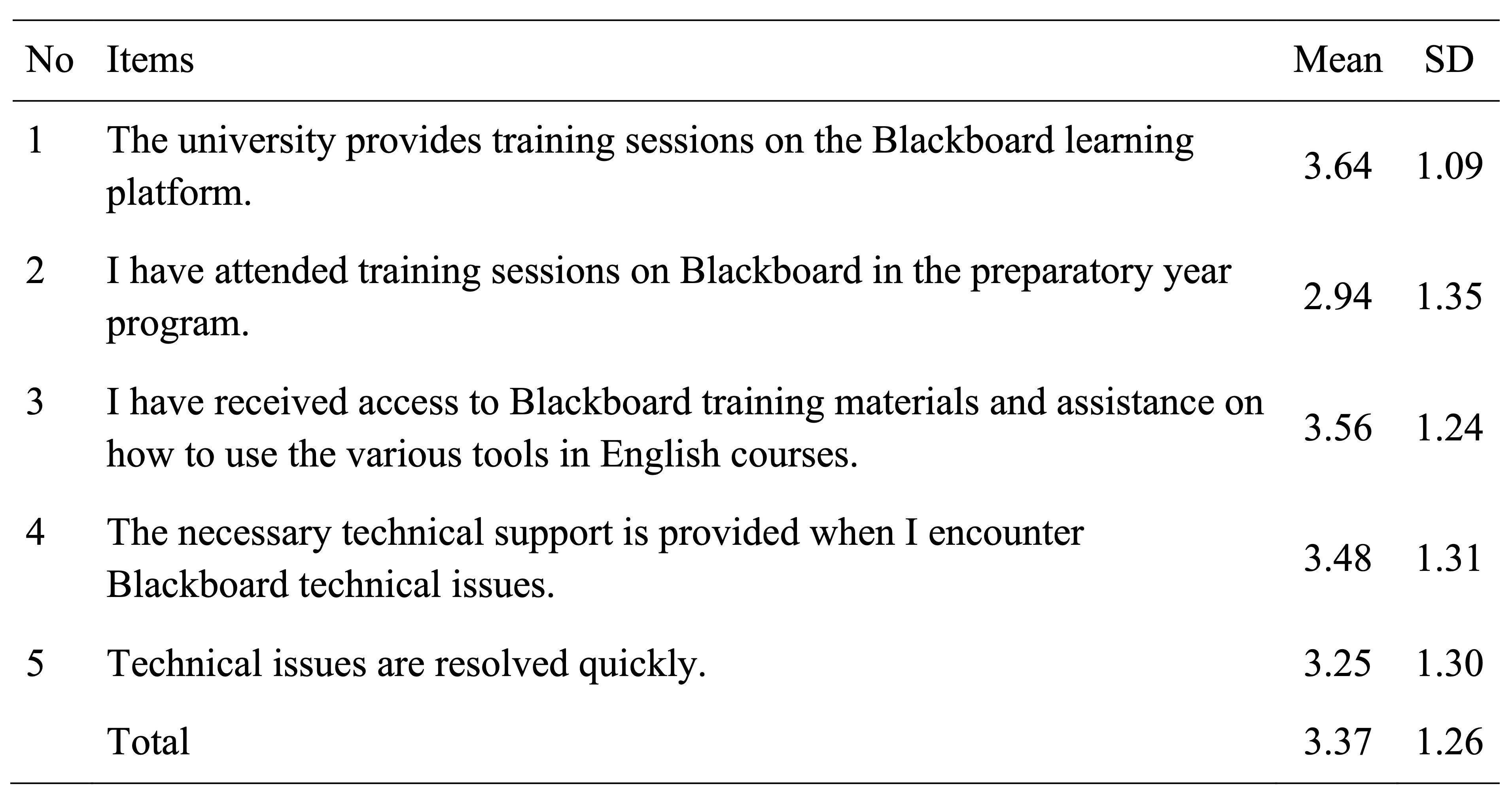 The students were asked to respond to five items to identify the institutional support and the resultant challenges regarding distance education. The mean and standard deviation in Table 1 illustrates that the overall mean of the student’s responses to the five items ranged from 2.94 to 3.64. This showed institutions’ support and challenges in distance education when distance learning was adopted fell in the moderate category (M=3.37, SD =1.26). In addition, these findings reflect the university’s provision of training sessions on the Blackboard learning platform (M = 3.64, SD = 1.09). The students received access to Blackboard training materials and were assisted in using the various tools to support their learning in English courses (M = 3.56, SD = 1.24). Other findings showed that the students received the necessary technical support from the technical support team (M = 3.48, SD = 1.31), and their technical issues were resolved quickly (M = 3.25, SD = 1.30). Finally, the students reported that they had attended training sessions on Blackboard in the preparatory year program during the COVID-19 pandemic (M = 2.94, SD = 1.35), and this item had the lowest mean.