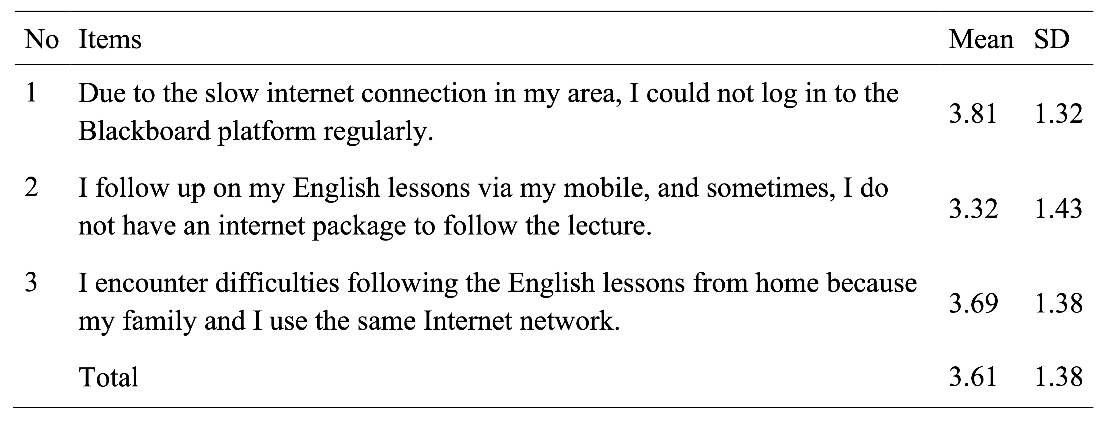 The students were asked to respond to three items to identify their challenges when attending their English classes during the COVID-19 pandemic. The students’ responses to each questionnaire item regarding issues with the network ranged from 3.32 to 3.81. This showed that the student’s problems with the network fell into the moderate to high categories. Table 2 shows that most students encountered difficulties logging into the Blackboard platform regularly due to internet connection issues in their local areas (M = 3.81, SD = 1.32). Furthermore, as the results reveal, the students encountered some difficulties with the internet connection since all the family members were using the same Internet network, making the connection much slower (M= 3.69, SD = 1.38). Finally, the findings indicated that a few students needed the Blackboard Application to connect and attend English lessons on their mobile phones (M = 3.32, SD = 1.43).
