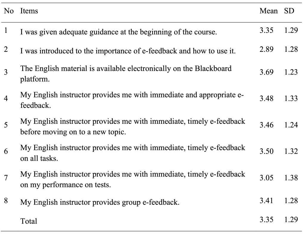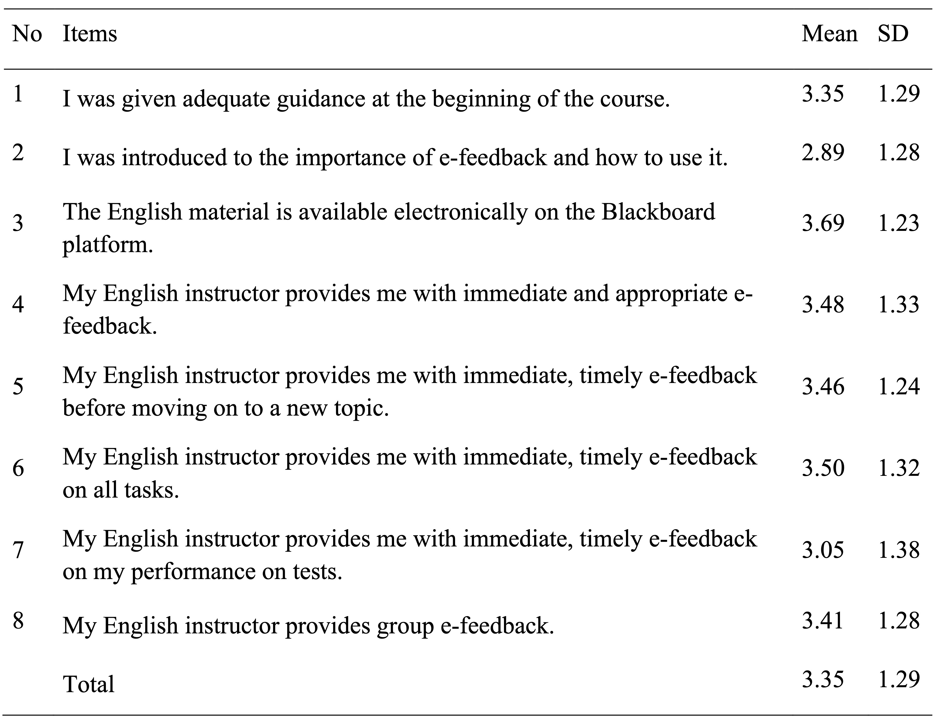 Based on the descriptive analysis of the eight items related to supports and challenges with e-feedback practices, as shown in Table 3, the overall mean of the students’ responses ranged from 2.89 to 3.69, falling into moderate to high categories. For example, one item in this section, “the English material is available electronically on the Blackboard platform,” was rated 3.69 (high category). In contrast, the rest of the items fell into a moderate category.