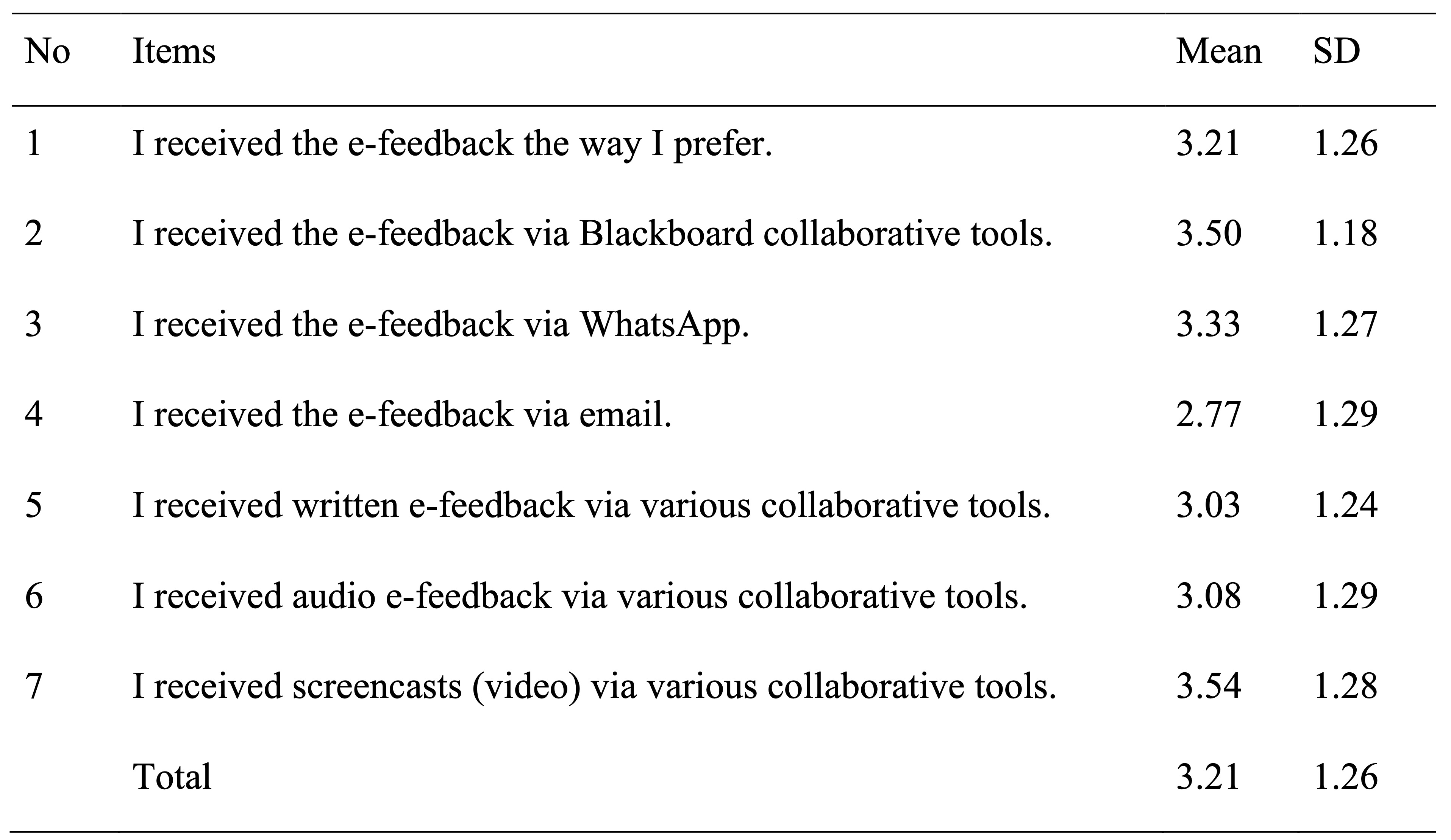 The findings indicated that the students reported that their instructors have sufficient experience providing appropriate feedback (M = 3.45, SD = 1.26). They also reported that the e-feedback helped them achieve course learning outcomes (M = 3.41, SD = 1.22), improved their performance (M = 3.36, SD = 1.30), and helped them employ the most effective learning strategies to learn English (M = 3.34, SD = 1.29). Furthermore, the students reported that they had the opportunity to discuss the e-feedback with their English instructors (M = 3.33, SD = 1.27). As a result, they understood the e-feedback and modified their tasks based on the feedback (M = 3.33, SD = 1.25). Finally, the findings indicated that some students found e-feedback annoying and did not take advantage of it (M = 3.12, SD = 1.21).