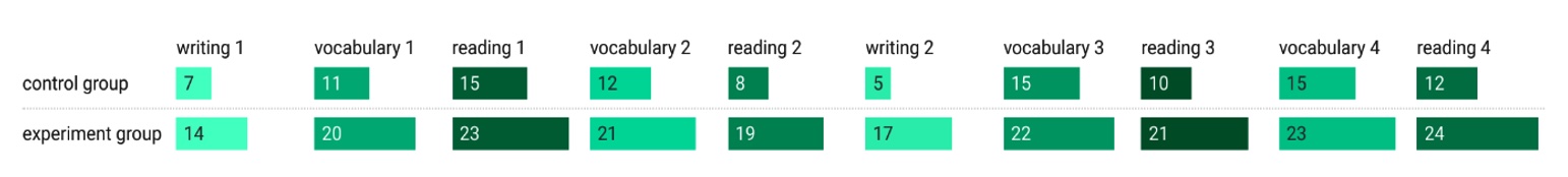 As shown in Figure 1, 10 activities were assigned to the students to be completed voluntarily. It was mentioned earlier that each group has 25 members. To this end, the figure showed the experimental group’s highest engagement in the accomplishments of the activities. In writing activities, 12 essays were submitted by the control group participants, while 31 writing pieces were submitted in the experimental group. Regarding vocabulary, 53 activities were submitted in the control group for four assignments, while this number touched 86 activities in the experimental group. Finally, the data on reading revealed that 45 activities were completed successfully in the control group, while 87 activities were submitted through chatbots. The results found that those students who received the course instructions, explanations, activities, and feedback through chatbots showed better performance than their counterparts in the control group who were exposed to face-to-face instructions. It is worth noting that the engagement in all the abovementioned assignments was entirely voluntary, so students were the decision-makers on whether to complete or ignore the task.