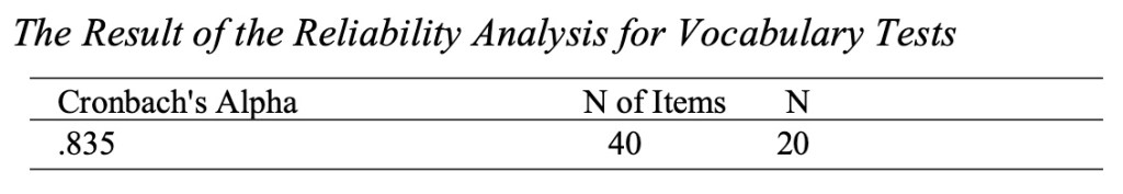 As can be observed from the table above, the reliability of 40 vocabulary tests was revealed to be 0.835, which showed a high degree of reliability.